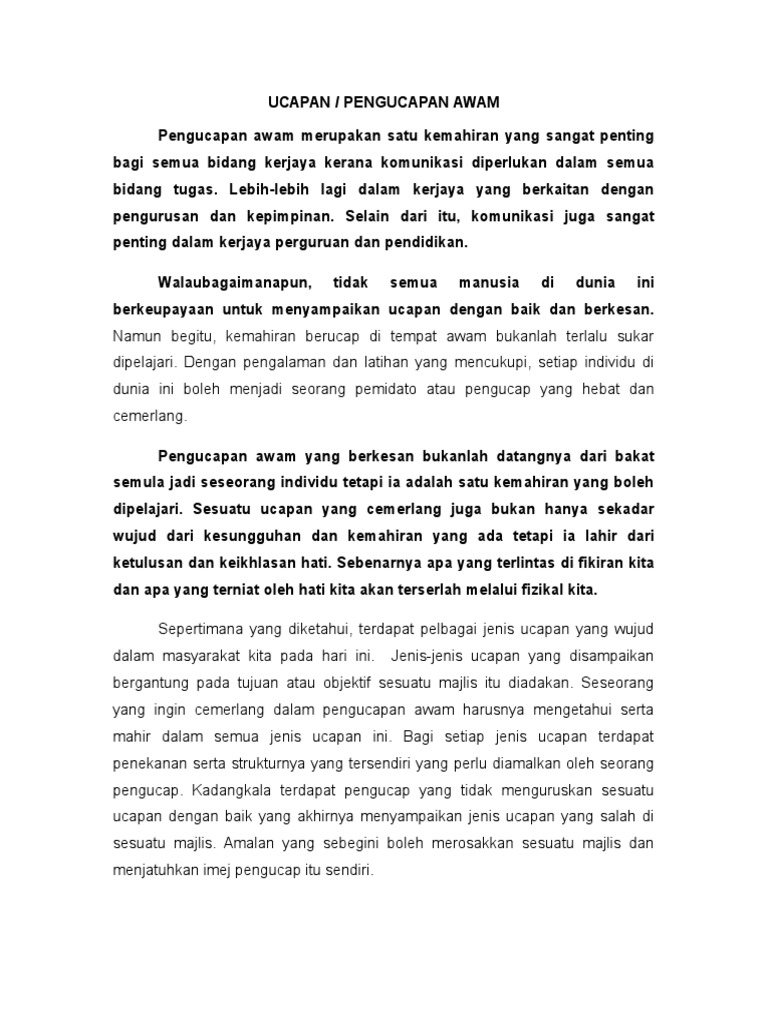 Tujuan ucapan adalah untuk memberi maklumat kepada pendengar mengenai sesuatu perkara dan isu serta juga boleh dilakukan secara syarahan umum. Pengucapan awam merupakan satu bahan bagi penyampaian maklumat yang berkesan. Membuat pengucapan awam semasa induksi umum penjawat awam di institut tadbiran awam (intan tengah). Pengucapan awam ini saya karang apabila kakak saya meminta saya untuk mencarikannya sebuah karangan pengucapan awam. Pengucapan awam komunikasi berkesan untuk pemimpin pernahkah anda terlibat dalam beberapa insiden dan peristiwa seperti di bawah ? Koleksi contoh esei karangan spm 2013 terbaik isu semasa karangan esei spm. Semasa pengucapan awam, jangan tengok slide. Ada 20 gudang lagu pengucapan awam isu keruntuhan akhlak pelajar se terbaru, klik salah satu untuk download lagu mudah dan cepat. Menu cara tutup konsep 1. Nampak tidak yakin diri dan tidak profesional. Abaikan orang yang tidak beri perhatian. Pengetahuan am/isu semasa memperkasakan pdrm dalam memelihara keselamatan serta mengekalkan keamanan, polis diraja malaysia (pdrm) memberi tumpuan untuk memperkasakan sumber manusia serta menghalakan gerak kerja dan inisiatif berpandukan 3 fokus utama iaitu: Siri pertama tips pengucapan awam bersama speaker big ideas training & consultancy.